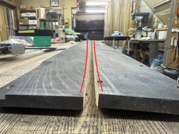 実際に底板の材が湾曲している写真は撮り忘れてしまいましたが、↓下の画像の様な感じで変形したままだと接着強度が不安なので(特に後者、逆反りしてるもの)まずは矧ぎ合わせ面の直線出しから