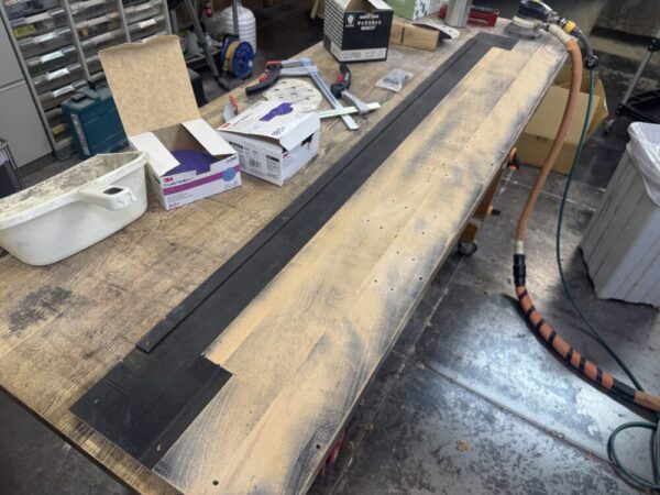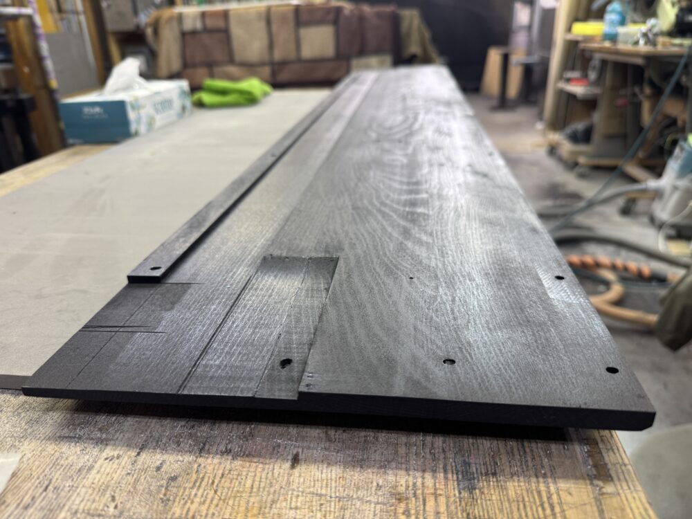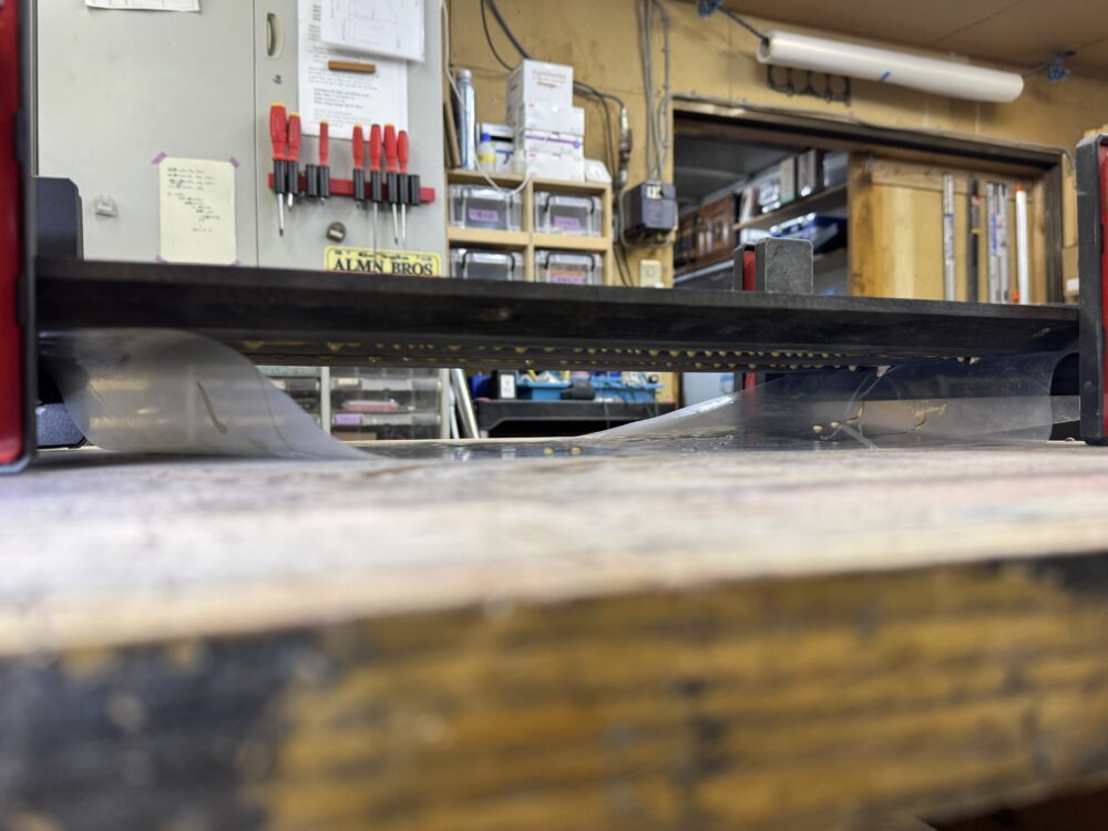 プロの木工屋さんの様な手押し鉋などは無いのでホームセンターのパネルソーで直線切りしてもらったコンパネを治具としてトリマーで直線を出すことに。