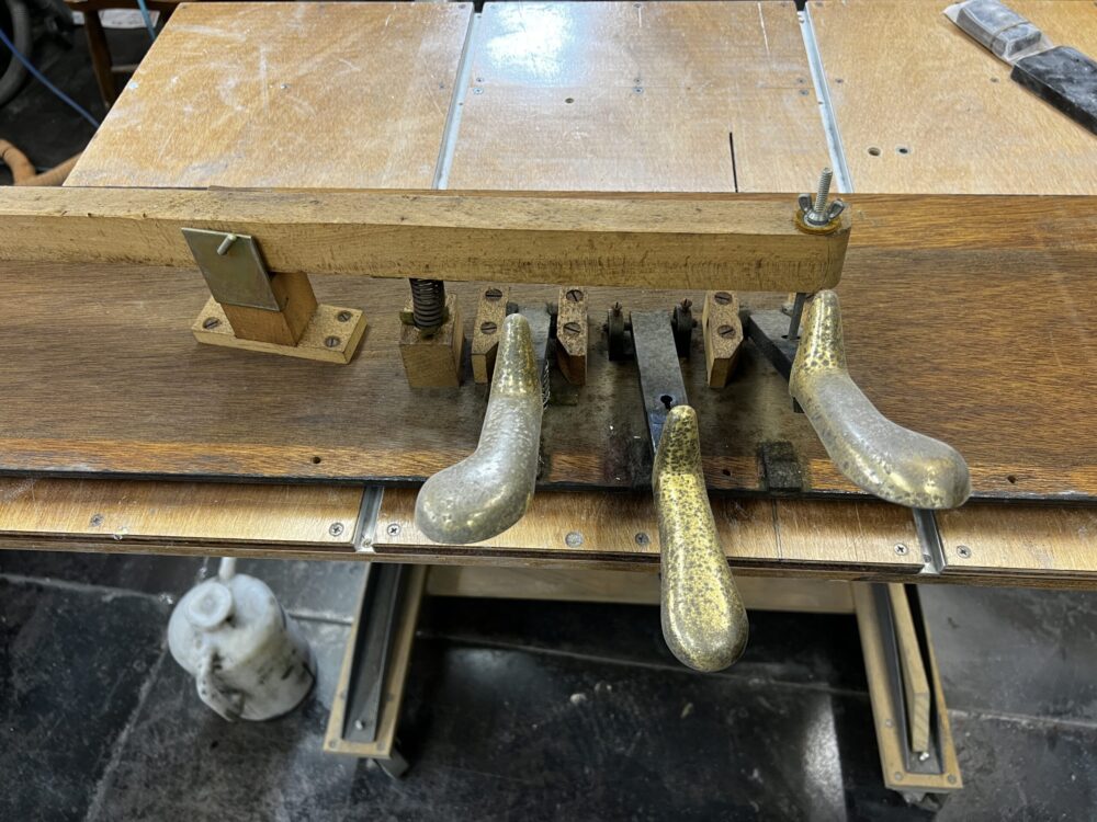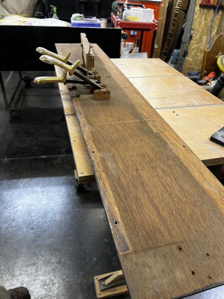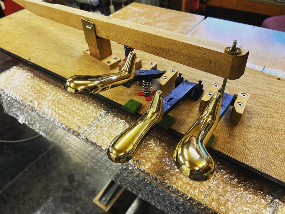 全塗装でお預かりしてるKAWAIの KS1という古めのアップライトピアノは塗りまで終わっていて、鏡面にみがくためにまず研ぎを進めつつ、ペダルや底板を綺麗にしました。